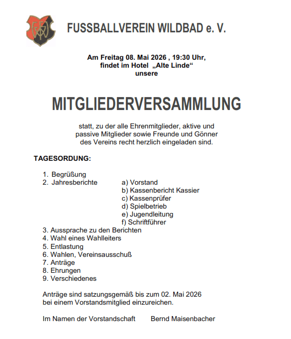 Am Freitag, 16.05.2025 fand in der Gaststätte „Alte Linde“ in Wildbad die gut besuchte Mitgliederversammlung des FV Wildbad statt. Nach der...